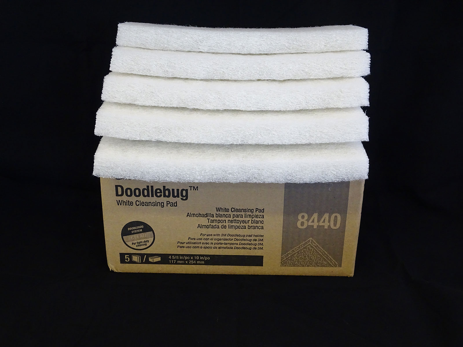 The 3M™ Doodlebug™ White Cleaning Pad 8440 safely cleans ceramic glass, tile, and fiberglass, and will remove scuff marks from floors without dulling the finish. The pad fits 3M™ Doodlebug™ Pad Holders and 3M™ Doodlebug™ Handblock Pad Holders. It’s similar in material and construction to the 3M™ White Burnish Pad for floor machines. Fine polishing particles dispersed throughout the polyester mesh guarantee high performance over the mat’s life. An open structure resists loading and allows the pad to be washed out and reused. The pad is suggested for use on non-skid flooring and other rough surfaces. Testing the pad in an inconspicuous area is recommended before use on plastics, fiberglass, and finished flooring.